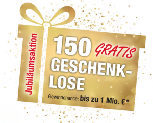 Als Dankeschön zu unserem Jubiläum erhalten die ersten 150 Bestellungen ein gratis Geschenk-Los mit Gewinnchancen auf bis zu 1 Million € *